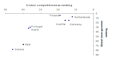 The argument here is that some countries in Europe are further from the liberal-democratic, social-market end-state than others. Crudely: some states have not reached the ‘end of history’, as Fukuyama put it. When you read about the Greek crisis exposing sub-optimal tax collection, inefficient bureaucracy, state corruption, closed-shop professions, inflexible or under-the-table labour markets, you are reading about the modernization meme. One could cite myriad indicators to illustrate this meme; I’ve used global competitiveness (source: IMD) and corruption perceptions (Transparency International).